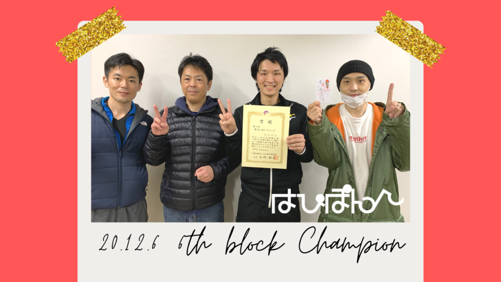 東卓2020年後期リーグ【はぴぽん♪】デビュー戦 6部ブロック1位!5部昇格☆ 2020年12月6日 HOT NEWS 東卓2020年後期リーグ戦へ【はぴぽん♪】で初参戦!6部「Oブロック優勝」→ 5部に昇格しました。みんないい顔で記念撮影☆6部デビュー戦は全勝で華々しくスタートできました。 部をガンガン駆け上って行きたいところ―ネクスト、5部に挑戦します♪