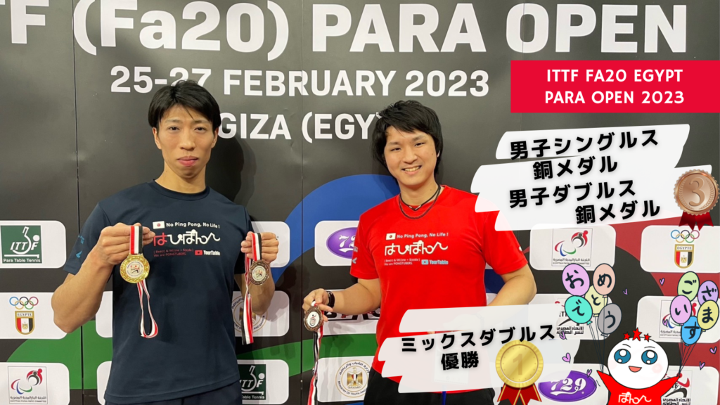 ITTF Fa20 Egypt Para Openに、はぴぽん♪から立石アルファ裕一(TATEISHI Arufuahirokazu JPN)選手が出場!みごとシングルス:銅メダル、男子ダブルス:銅メダル、ミックスダブルス:金メダルの成績を収めました。