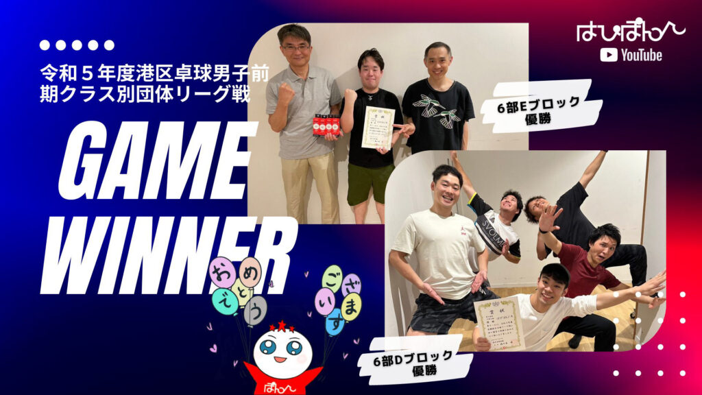 令和5年度港区卓球男子前期クラス別団体リーグ戦にてはぴぽん♪A・Bともに6部で優勝 2023年7月9日 HOT NEWS 7月9日(土)港区スポーツセンターで令和5年度港区卓球男子前期クラス別団体リーグ戦が開催されました。A・B2チームが参加してDブロック・Eブロックともに優勝しました! いつも応援をありがとうございます。