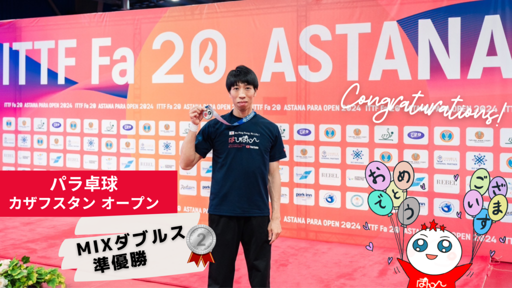 立石アルファ裕一選手はチェバニカ選手(個人)との国際ペアで、みごと混合ダブルス(クラスXD14)決勝まで勝ち進み、この「パラ卓球 カザフスタン オープン大会」クラスXD14で銀メダルを獲得したとのこと☆